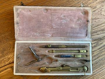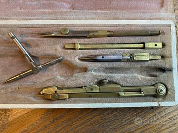 ANTICO COMPASSO SIMPLON MILANO DEI PRIMI DEL 900 IN OTTONE CON CUSTODIA IN PELLE COME DA FOTO SONO PRESENTI 4 PARTI DEL SET DEL COMPASSO PIU' UNA QUINTA CHE PERO'NON ENTRA NEGLI SPAZI FORSE AGGIUNTA DOPO LE 5 PARTI SONOIN BUONE CONDIZIONI E FUNZIONANTI LA CUSTODIA MISURA 20 X 9 CM IN BUONO STATO ANCORA CON IL VELLUTO E CON LE CERNIERE FUNZIONANTI