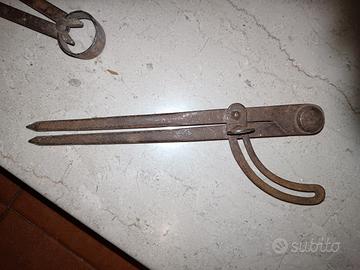 antico compasso a punte secche in acciaio, noto anche come divisore alare o calibro..Strumento per tracciare o misurare, utilizzato in officina su metallo o legno, regolabile tramite una vite di regolazione per mantenere salda l'apertura.