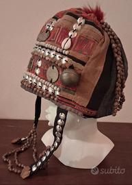 Antico copricapo fatto a mano della tribù delle colline Akha della Thailandia con perline ricamate. È realizzato a mano con dettagli squisiti, con un motivo ricamato impreziosito da perline, conchiglie, campanellini metallici e monete applicati.