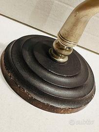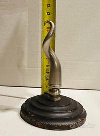 Materiale: Il corno presenta una finitura metallica, probabilmente ottone o metallo argentato/dorato, mentre la base è in legno scuro lavorato a gradini.