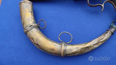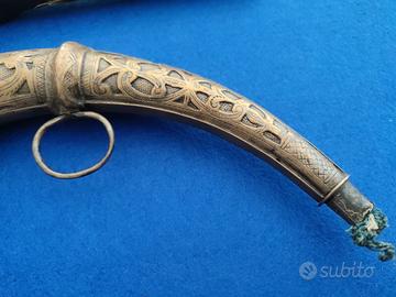 corno in metallo (rame o bronzo) databile dal 1700 al 1800 circa contenitore di polvere da sparo per armi ad avancarica dell'epoca, con una parte finemente lavorata e l'altra liscia come consuetidine dell'epoca. Per lo stato dello stesso vedi foto allegate.