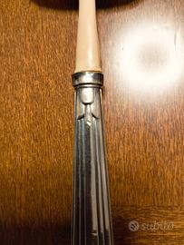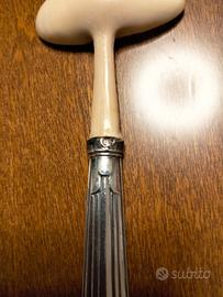 Buongiorno, vendo antico cucchiaio trasversale (Querlöffel) da bouillie, art -déco, con la parte superiore in osso o corno, e il manico in argento 800, la punzonatura si trova all'inizio del manico nella parte posteriore, purtroppo è illeggibile, causa l'uso nei suoi parecchi anni. Grazie per l'attenzione.