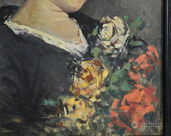 Dipinto ad olio su tela raffigurante il ritratto di una giovane donna, colta in un’espressione dolce e pensierosa, con lo sguardo rivolto verso il basso. L’artista ha reso la figura con pennellate morbide e cromie delicate: il volto, illuminato da toni caldi e naturali, è incorniciato da capelli scuri raccolti che esaltano il profilo elegante. 📏 Dimensioni • Solo dipinto: 55 × 40 cm • Con cornice: 70 × 53 cm ✔️ Ottime condizioni generali: colore stabile senza sollevamenti, cornice coeva in legno ebanizzato in ottime condizioni. Note storiche L’opera si inserisce nella tradizione pittorica ottocentesca, caratterizzata dal gusto per il ritratto realistico e dall’attenzione alla resa psicologica del soggetto. La delicatezza cromatica e la sensibilità espressiva rimandano alla scuola napoletana e francese del XIX secolo, in cui i ritratti femminili simboleggiavano grazia e intimità domestica. ✅ Spedizione sicura con imballaggio antiurto ✅ Per ulteriori informazioni non esitate a contattarmi Mercatino dell'antiquariato Tiriciclo , Salern