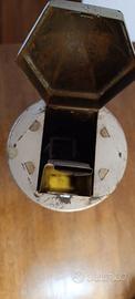 Piccolo dispenser di cioccolato in lamiera argentata progettato come chiosco cittadino con decorazioni stampate delle pubblicità del marchio. Nel 1830 l'azienda Menier realizzò in Francia la prima fabbrica meccanizzata per la produzione di massa di polvere di cacao. In seguito allo sviluppo del cioccolato solido, hanno introdotto sul mercato una tavoletta di cioccolato avvolta in una carta gialla decorativa. Questo distributore di caramelle Menier sembra essere stato realizzato negli anni '30 e conserva la grafica originale. Usura compatibile con l’età e l’utilizzo. Lievi mancanze. Lieve sbiadimento. Non restaurata con una bella grafica originale. Altezza: 26,04 cm (10,25 in)Larghezza: 10,8 cm (4,25 in)Profondità: 10,8 cm (4,25 in)