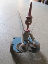 Ad amatore vendo antico e raro giocattolo in legno degli anni 40/50 ,in buone condizioni ,il famoso pinocchio con carrettino. Il giocattolo funziona con meccanismo a trascinamento. Pinocchio viene spinto con un bastone in legno e muovendosi suona sbattendo i piattini ,.altezza cm 29,larghezza cm 16,5 e lunghezza cm 82.I colori realizzati a mano sono originali dell'epoca.Euro 200,00 non trattabili
