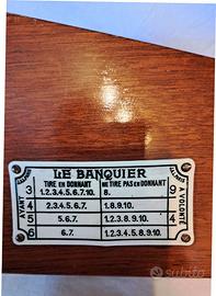 La targhetta laterale color avorio Le Banquier e’ avvitata con 4 viti ed e’ a rilievo, incisa, ha le indicazioni della casa costruttrice J.A.J. Paris e il riassunto delle regole per giocare a baccarat