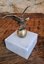 Antico ferma carte con scultura di un'aquila un con ali spiegate appollaiata sopra un globo metallico. Periodo fine 800, finemente lavorata in bronzo dorato e base marmo bianco di carrara. Probabilmente un fermacarte da scrivania di un ufficiale degli alpini della grande guerra. In alcuni contesti, specialmente in ambito militare (come per gli Alpini o legioni storiche), queste figure venivano usate come decorazioni superiori per aste.