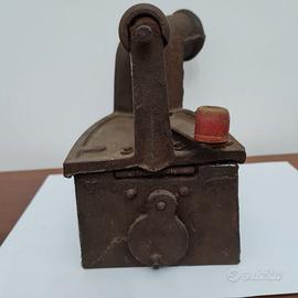 Privato cede antico e magnifico ferro da stiro a carbone in ghisa, modello detto a "camino" - epoca XIX-XX secolo ( prima metà ) - MISURE: Altezza totale 19,5 cm c.a.- Lunghezza piastra fondo 19 cm - Larghezza 12,3 cm - Il ferro da stiro è costituito da 4 pezzi: una base che fungeva da contenitore della brace forata sul lato posteriore; un coperchio legato alla base tramite una cerniera di ferro; la parte superiore è caratterizzata da un’impugnatura lignea e da un tubo a mo' di camino utile alla fuoriuscita del vapore. NO PERDITEMPO GRAZIE!