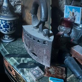 Ferro da stiro a carbone Realizzato in metallo pesante, con coperchio a cerniera manico in legno e aperture laterali per il tiraggio dell’acqua