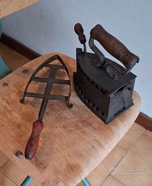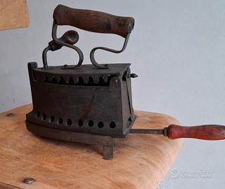 antico ferro da stiro, misura grande, con manico in legno. porta carbonella. molto bello, dotato anche di appoggia ferro suo originale con manico in legno.