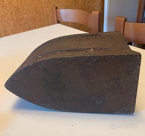 Ferro da stiro antico, in ghisa (pesa circa 3 kg) con manico in legno. Ha una leva per aprire e chiudere il serbatoio del carbone. Altezza 20 cm , lunghezza 20 cm, larghezza 10 cm.