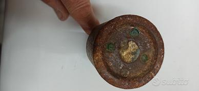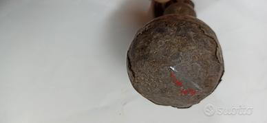 Gancio antico in metallo con un peso sferico, parte di una vecchia bilancia a bascula. Presenta segni del tempo che ne attestano l'autenticità. - Gancio in metallo arrugginito. - Peso sferico con finiture lavorate. - Ideale per collezionisti o come elemento decorativo vintage.