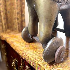 L’aria del tempio era impregnata del profumo dolce dell’incenso, mentre le candele tremolavano silenziose davanti alle statue degli dei. Il giovane Arun aveva appena compiuto sette anni e, quel giorno, camminava a piccoli passi dietro a sua nonna, aggrappato al bordo del suo sari color zafferano. Era una giornata speciale: la benedizione del suo nuovo giocattolo del tempio. L’elefante di ottone brillava sotto la luce fioca, le sue forme massicce e solenni sembravano quasi vive. Arun ricordava ancora le parole del nonno, pronunciate la sera prima: “Un elefante con la proboscide sollevata porterà sempre fortuna alla tua casa. Spingilo piano, e la sua forza guiderà anche i tuoi passi.” Quel piccolo elefante su ruote non era solo un gioco: era un simbolo di protezione, destinato a vegliare su Arun e sulla sua famiglia. Ogni mattina, la madre gli faceva spingere l’elefante da un lato all’altro della veranda, credendo che quel gesto avrebbe portato prosperità e tenuto lontane le disgrazie. Con il tempo, l’elefante trovò posto in un angolo della casa, e la sua patina dorata iniziò ad assumere sfumature scure, quasi brunite. Ma Arun, ormai adulto, non mancava mai di sfiorarlo con la punta delle dita ogni volta che tornava a casa dai suoi viaggi: un gesto semplice, che lo riconnetteva ai giorni sereni dell’infanzia e alle parole del nonno. Oggi, quell’elefante attende un nuovo custode. Forse, in una nuova casa, questo piccolo guardiano troverà ancora una volta il suo posto, portando con sé la memoria di un’antica promessa di fortuna e protezione. Pesante; dimensioni ca 16 x 11.5 altezza 18.