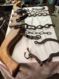 vendo antico giogo di 110 cm. dove si legavano animali da traino per lavorare la terra o trainare carri completo di tutte le sue parti. il laccio di cuoio di uno dei due ganci laterali si è rotto come si vede nelle fotografie