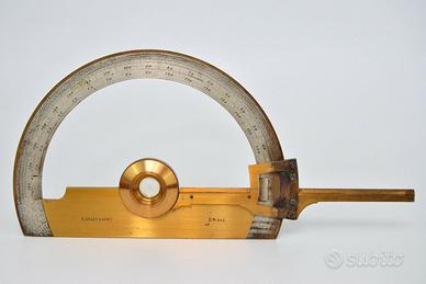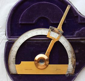 Antico e raro goniometro semicircolare in ottone dorato, realizzato da E. Kraft & Sohn, con sede a Vienna, nel 1840 circa, serie n. 356. Carl Eduard Kraft è nato in Germania nel 1795 ed è morto a Vienna (dove si stabilì nel 1816) nel 1880. La ditta ha prodotto diversi strumenti scientifici, in particolare topografici (bussole, teodoliti). Si tratta di uno strumento geometrico, dotato di una mira di centraggio, argentatura sull’arco graduato, nonio di precisione della lettura fissato al braccio mobile e dorso rivestito di una pellicola di materiale antiattrito. Lo strumento è corredato della sua custodia originale con struttura in legno, rivestita internamente in velluto colore viola ed esternamente in pelle con evidenti segni di usura, le cui dimensioni sono 26,5 cm x 13 cm x 2,5 cm.