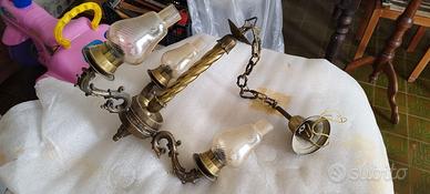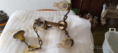 Lampadario in bronzo ed ottone con tre punti luce completo di terminali in vetro