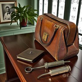 👜 Borsa medica in cuoio con serratura in ottone 1930–1940 in cuoio marrone spesso, con cuciture rinforzate. Chiusura funzionante con placchetta frontale in ottone senza chiave. Interno foderato con tasca. Usura e patina coerenti con l’epoca; manici robusti e cuciture solide; segni del tempo visibili e affascinanti.