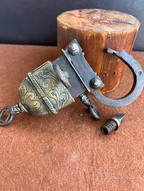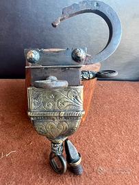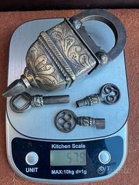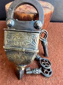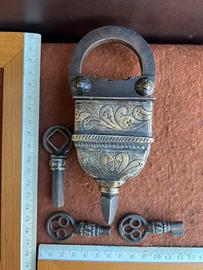 Lucchetto antico in ferro battuto con segreto, 3 chiavi finalmente decorato e inciso con ottone e rame perfettamente funzionante. Ideale per decorare bauli, vetrine, porte, ecc. Le foto sono parte integrante della descrizione e ne evidenziano la bellezza, la fartezza, le caratteristiche e le condizioni che a mio avviso, visto il tempo trascorso sono ottime. Per chi lo preferisce, ritiro a Trezzano Sul Naviglio (MI) oppure spedirne in tutta Italia con corriere Espresso al costo di 12,00€
