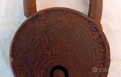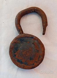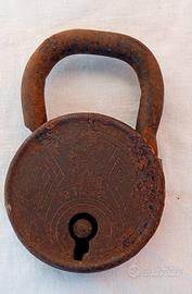 Lucchetto antico in metallo ideale per collezionisti. Si vede un timbro con un cavaliere a cavallo guardare foto. Senza la chiave. Misura cm. 10 x 6