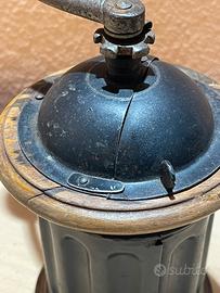 Macina caffè manuale antico da tavolo, databile ai primi decenni del Novecento, in metallo e legno con manovella originale in ferro.