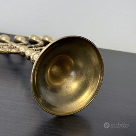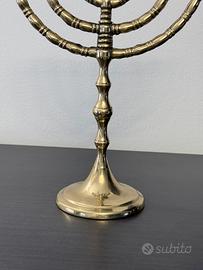 Antico Menorah, candelabro ebraico a sette bracci che rappresenta uno dei simboli più antichi e iconici della tradizione e della fede ebraica.Composta da uno stelo centrale da cui si dipartono sei bracci curvi (tre per lato), per un totale di sette portacandele. Pezzo incredibile di religione e storia.