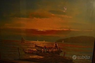 quadro, olio su tela, pittura antica, pittura vintage, arte figurativa, scena marina, paesaggio marino, pescatori, barche, molo, decorazione interni, oggetti scenografici, materiali per arte contemporanea, vintage, teatro, exhibition object, stage props, peinture ancienne, tableau, peinture sur toile, marine, rétro, teatro, decoración, lienzo, pintura al óleo, vintage painting, oil painting, landscape, seascape, fisher, barca, antique painting, gemälde, öl auf leinwand, vintage kunst, malerei, fischerboot, szenografie.
