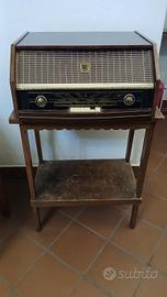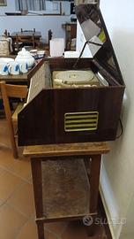 Antico mobiletto con radio giradischi vintage, simile a modelli prodotti da marchi come Philips negli anni '50 e '60. Ecco alcuni dettagli basati su dispositivi simili: Funzionalità: Questo tipo di apparecchio combina una radio a valvole (spesso in grado di ricevere onde medie, corte e FM) con un giradischi integrato per vinili. Giradischi: Il meccanismo spesso supporta diverse velocità (33, 45, 78 giri). La radio necessita di lubrificazione e revisione in quanto non essendo stato utilizzato da tempo, non si accende. Design: Il mobile è realizzato in legno, caratteristica tipica del design d'epoca. Stato: È possibile trovare questi articoli in vendita sia funzionanti che "da sistemare" o come pezzi di ricambio.