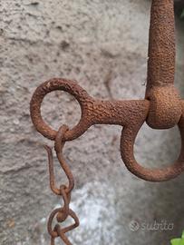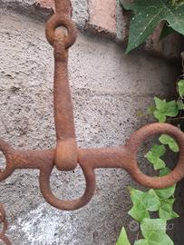Antico e raro morso da cavallo primi 800 con anelli e catenella in metallo forgiato a mano e con caveze in cuoio Notare il dettaglio del fermo centrale orizzontale tutto di un pezzo, mentre solitamente è composto da due pezzi misure in foto Bellissimo oggetto da collezione, da arredamento country e da esposizione Testimone di uno tempo e di una civiltà ormai perdute