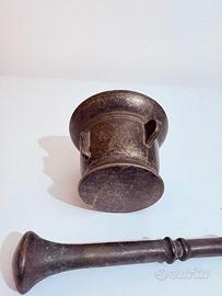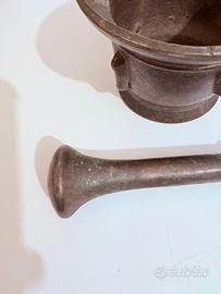 Vendo splendido mortaio antico completo di pestello originale, realizzato in ottone. Presenta una bella patina scura naturale che ne valorizza il fascino. Il corpo è solido e decorato con alette laterali. Ideale come complemento d’arredo o pezzo da collezione. Buone condizioni generali con normali segni del tempo. Dimensioni: altezza 8 cm x diametro 11 cm - pestello lungo 18 cm.