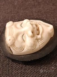 Antico netsuke giapponese di materiale pregiato, epoca Meiji (1868-1912) che rappresenta la maschera di Okina del teatro tradizionale giapponese. Misure cm. 4 per 3, è fissato su un ovale di legno cm. 5 per 4. La maschera è molto espressiva ed accurata nei particolari,un vero piccolo capolavoro.