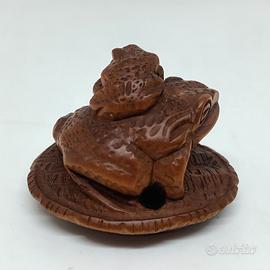Il soggetto raffigura due rospi accuratamente scolpiti posati su un sandalo tradizionale giapponese (waraji), scena rara e ricca di significato simbolico, spesso associata a protezione, prosperità, ritorno sicuro e buona fortuna nel folklore giapponese.