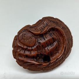 Importante netsuke giapponese antico originale, firmato Masanao, maestro noto per la straordinaria qualità espressiva delle sue opere, realizzato con la tradizionale tecnica Hitobori, caratterizzata da un intaglio diretto, libero e profondamente materico.