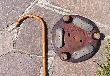 Antico ombrellino / parasole da passeggio di inizio '900 - in seta e con manico in legno - base di appoggio in legno e bastoncino da passeggio a corredo - bellissimo ed elegante insieme - misure : lunghezza cm. 105 e apertura cm. 85 - Nonostante alcuni piccolissimi difetti del tessuto, non sono necessari interventi di riparazione o restauro ma solo di una leggera rinfrescata all'insieme.