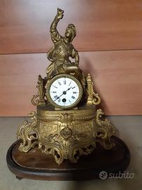 Orologio da tavolo in bronzo dorato dell’ 800, stile francese, con campana di vetro originale, base in legno e chiave di ricarica.