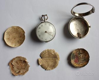 Antico e originale orologio inglese da taschino per uomo, con doppia cassa in argento sterling, prodotto a Londra nel 1808, con splendido movimento di buona qualità inciso "George Plummer London", in ottime condizioni, che funziona bene ed esegue l’intera lunghezza della catena. Funzionamento meccanico a carica manuale con scappamento a verga, serie n. 8771. L’orologio è corredato di vecchi documenti di riparazioni effettuate da orologiai inglesi, compresa una carta dei marinai Farewell. Entrambe le casse sono marchiate per Londra 1808 e sono in ottime condizioni, le cerniere sono belle e robuste, tutte le copertine si chiudono in stretta aderenza. Vetro cristallo bombato originale con lente centrale. Cassa esterna in argento sterling massiccio in ottime condizioni, lucidata a mano, del diametro di 56 mm; diametro cassa interna 49 mm. Orologio di spessore 28 mm e peso di 132 grammi. Quadrante originale in ceramica smaltata bianco. Lancette originali in oro massiccio.