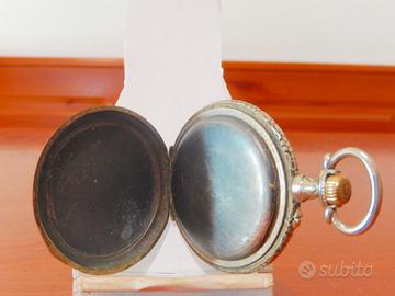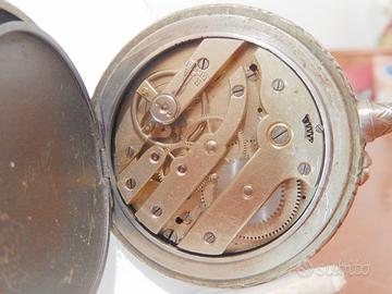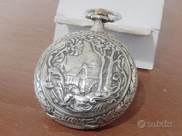 Antico orologio da TASCA primi del 900 con quadrante in ceramica , vetro minerale e lancette lavorate . Cassa interamente lavorata con splendida figura in rilievo sul retro . Diametro cassa mm 52 . Movimento meccanico a carica manuale . L'orologio e' in buone condizioni e funzionante .