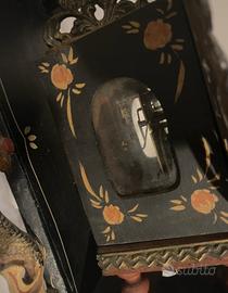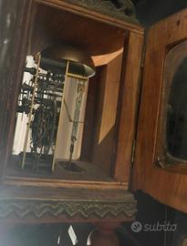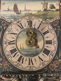 Antico orologio olandese da parete, bellissimo, molto articolato credo intagliato a mano. Non so di che anno sia. La facciata sembra dipinta a mano. Alto circa 50 cm. Ci sono due sirene ai lati, dietro la facciata c’è una cassa con due sportelli che si aprono dai lati e fanno vedere il meccanismo dell’orologio. Compreso di pendolo e due pesi. Il meccanismo dovrebbe funzionare ma non so come si regolano i pesi.