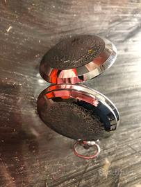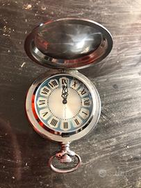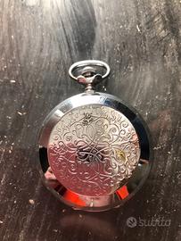 Delizioso orologio da tasca Molnija anni '70, cassa in metallo finemente decorata con decori liberty, funzionamento meccanico a carica manuale, quadrante colore azzurro sfumato, numeri romani neri su scudo smaltato color bianco, perfettamente funzionante.