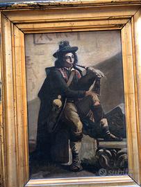 Antico personaggio Suonatore di Zanpogna Olio su tela Cornice Coeva 35.46