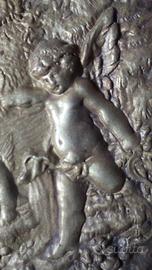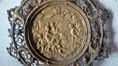 Antico piatto in bronzo con figure in rilievo. Epoca primi '900