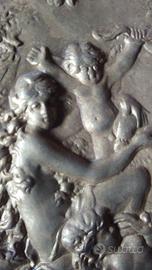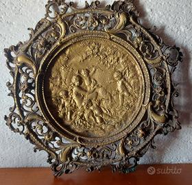 Antico piatto in bronzo con figure in rilievo