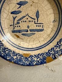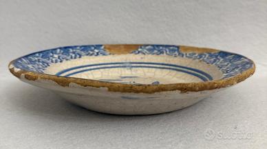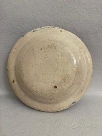 Antico piatto in maiolica di Caltagirone. Risale alla fine del 1800 e presenta difetti consistenti in perdita della ceramica soprattutto ai bordi, tuttavia mantiene il suo fascino
