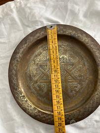 Piatto antico in ottone inciso a mano, di probabile produzione mediorientale / nordafricana (area marocchina – Marrakesh), databile tra fine XIX e inizio XX secolo.