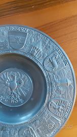 Antico piatto in peltro diametro 23 cm. con stemmi di Bolzano, Merano, Bressanone. Brunico, Chiusa, Glorenza, Nalles, ecc..
