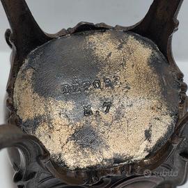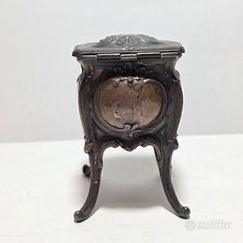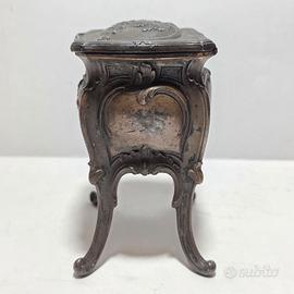 Piccolo Portagioie in metallo di origine Francese e risalente alla fine del XIX Secolo. Il portagioie presenta il corpo bombato e lunghi piedini mossi, arricchito da festoni, fiori, volute e racemi in tutta la superficie. Ottime condizioni e bella patina, sotto presente marchio, all'interno è rivestito di verde. Lievi abrasioni e ammaccature d'epoca. Misure: 11.5 x 7.5 x 8.3 cm Ca. antiquariato scultura statua busto bronzo marmo ceramica dipinto quadro pittura arte antica olio su tela telaio cornice dorata legno intagliato mobili antichi armadio specchiera originale raro collezione restaurato autentico decorazione d'epoca antiquités première sculpture statue buste marbre céramique tableau peinture huile sur toile cadre doré bois sculpté meubles anciens armoire miroir rare collection restauré authentique décoration d’époque Antiquitäten altes e Skulptur Büste Marmor Keramik Gemälde Kunstwerk alte Kunst Öl auf Leinwand antiker Rahmen vergoldet Holz geschnitzt antike Möbel Schrank Spiegel selten Sammlung restauriert authentisch Dekoration aus der Zeit antigüedades escultura estatua bronce mármol cerámica cuadro pintura óleo sobre lienzo marco dorado madera tallada muebles antiguos armario espejo colección restaurado auténtico decoración de época antiques bust bronze marble ceramic painting artwork old oil on canvas frame gilded carved wood antique furniture wardrobe mirror restored authentic period decoration silver plata argento vetro vaso glass vase vitrio 400 500 600 700 800 900 liberty déco barocco neoclassico rinascimento gotico classico impero legno madera wood Luigi XVII XVI XV XVIII XIX XX