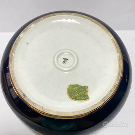 Decorata in stile Sèvres in blu cobalto con finiture in oro dipinte a mano e un medaglione al centro raffigurante una scena galante. Profili in bronzo. Firmata Robert. All'interno vi sono dei fiori. Nel fondo marchio K coronata.