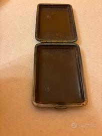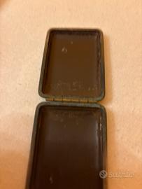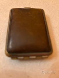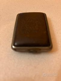 Raro ed elegante portafiammiferi tascabile d'epoca (Vesta Case), risalente alla fine del 1800 o ai primi del 1900. L'oggetto presenta una struttura in metallo con raffinati inserti in cuoio marrone pressato. Sulla parte frontale è presente uno stemma araldico in rilievo con leoni rampanti e la dicitura "BERLIN", che ne attesta la provenienza tedesca.