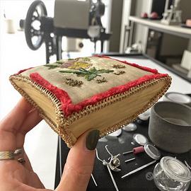 Un piccolo scrigno di memoria: questo puntaspilli ottocentesco porta con sé la delicatezza del tempo e delle mani che lo hanno ricamato. Il fiore, una viola del pensiero, emerge con i suoi petali gialli e malva, simbolo di affetto e ricordo - come se volesse custodire i pensieri di chi, un secolo fa, lo usava nei silenzi domestici. Le perline dorate aggiungono un tocco di luce discreta, mentre il velluto rosso che ne incornicia i bordi racconta di un gusto raffinato e femminile. Oggi conserva l’anima intima di un oggetto che non era soltanto utile, ma soprattutto un compagno silenzioso delle ore di lavoro, testimone di un passato fatto di ago e filo, di cura e di bellezza quotidiana.