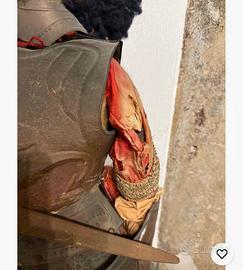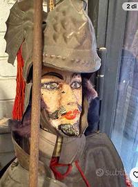 VERO CHE SICURAMENTE HA LAVORATO NEI TEATRI DEI PUPARI SICILIANI E' COMPLETO DEGLI ATTACCHI CHE GLI PERMETTEVANO DI MUOVERSI SULLA SCENA. E' COSTRUITO CON LEGNO E METALLO SBALZATO (NON SONO UN ESPERTO LO DESCRIVO COME LO VEDO SCUSATE SE CI SONO DELLE INESATTEZZA) TUTTA LA CORAZZA HA SBALZI MOLTO ARTISTICI DI FIERE,. SULL'ELMO C'E UNA SCULTURA DI ANIMALE E DA QUESTO SI PROPAGA UNA LUNGA CHIOMA . IL VESTITO ANCHE SE LOGORATO E' FINEMENTE RICAMATO A MANO, SICURAMENTE E' UN OGGETTO MOLTO ANTICO MA NON SIAMO IN GRADO DI DEFINIRE ESATTAMENTE LA SUA EPOCA.