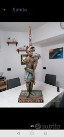 Bellissimo pupo siciliano antico. Molto ben definito in viso. I materiali penso che siano legno e ferro battuto. Si Apoggia su un piedistallo e ha una struttura che lo sorregge in legno. In giro col piedistallo in legno decorato non se ne vedono. La base è finemente decorata a mano con disegni tipici siciliani. Penso appartenga ai pupi costruiti dalla famiglia Argento ma non ne sono sicura al 100 per cento . Il tessuto della gonna intorno all'armatura è macchiato in alcuni punti di puntini gialli segni del tempo. Disponibile a fornire ulteriori dettagli fotografici. Ma con un accurato intervento dovrebbero venire via. Un po' impolverato nel complesso ma con una accurata manutenzione ritorna come nuovo. Un oggetto molto raro d'antiquariato. Ideale per appassionati del genere. Ma anche da esposizione per vetrine o ristorazione tipica siciliana. Molto bello. Lo vendo perché ereditato è non adatto al mio ambiente.